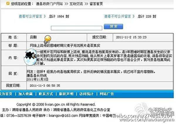 四、检索不到原图出处:刘家远杀子食子案原图藏湖南澧县档案局,数字图片原先挂在在该局的官网上,但现在看不到了。原因是有位叫“吕鹏”的网友在澧县政府门户网站留言,质疑“网络上流传的困难时期父煮子充饥照片是否真实”,认为“照片残忍残酷,但从照片上看其穿着不像是建国后的衣着,请县领导证实此事。首先不知道此事是否真实,其次如果真实这样残酷的内容也不适合公开,我对贵县档案局此举表示不解。”