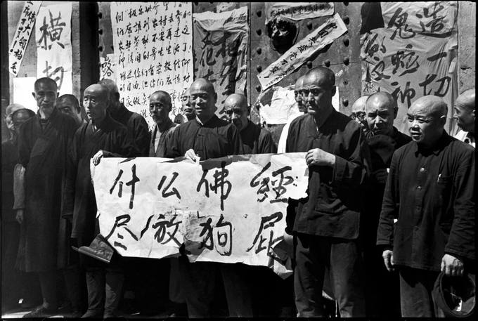 解说:1966年8月24日,文革“红八月”的风潮涌来,红卫兵们冲进极乐寺,捣毁所有的佛像,并写下了一张“什么佛经,净放狗屁”的标语,强迫和尚们擎着它低头认罪,时任《黑龙江日报》摄影记者的李振盛拍下了这个场景,照片中,法师们强忍着悲怒,方丈大师则高傲不屑地闭深了双眼,只有那个本以为已“参加了革命”,却仍被红卫兵拉出来受辱的叛逆者露出了尴尬的神情。