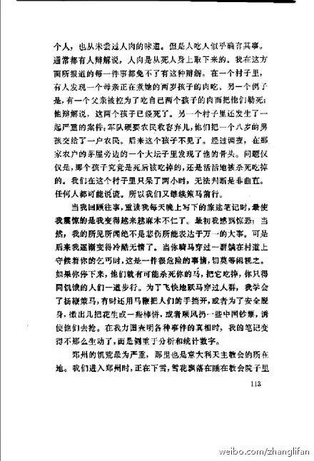 一、认为是民国大饥荒图片:有些维护毛泽东的左派网友,坚称图片为美国记者白修德所摄民国河南大饥荒图片,且有鼻有眼地标明出处:“[美]白修德:《探索历史》,马清槐、方生译,三联书店,1987年版,第113页。”经我下载该书核对,全书无图片,第113页更全部是文字(图2)。查阅当时发表河南大饥荒图片的美国《时代周刊》,也没有这组图。